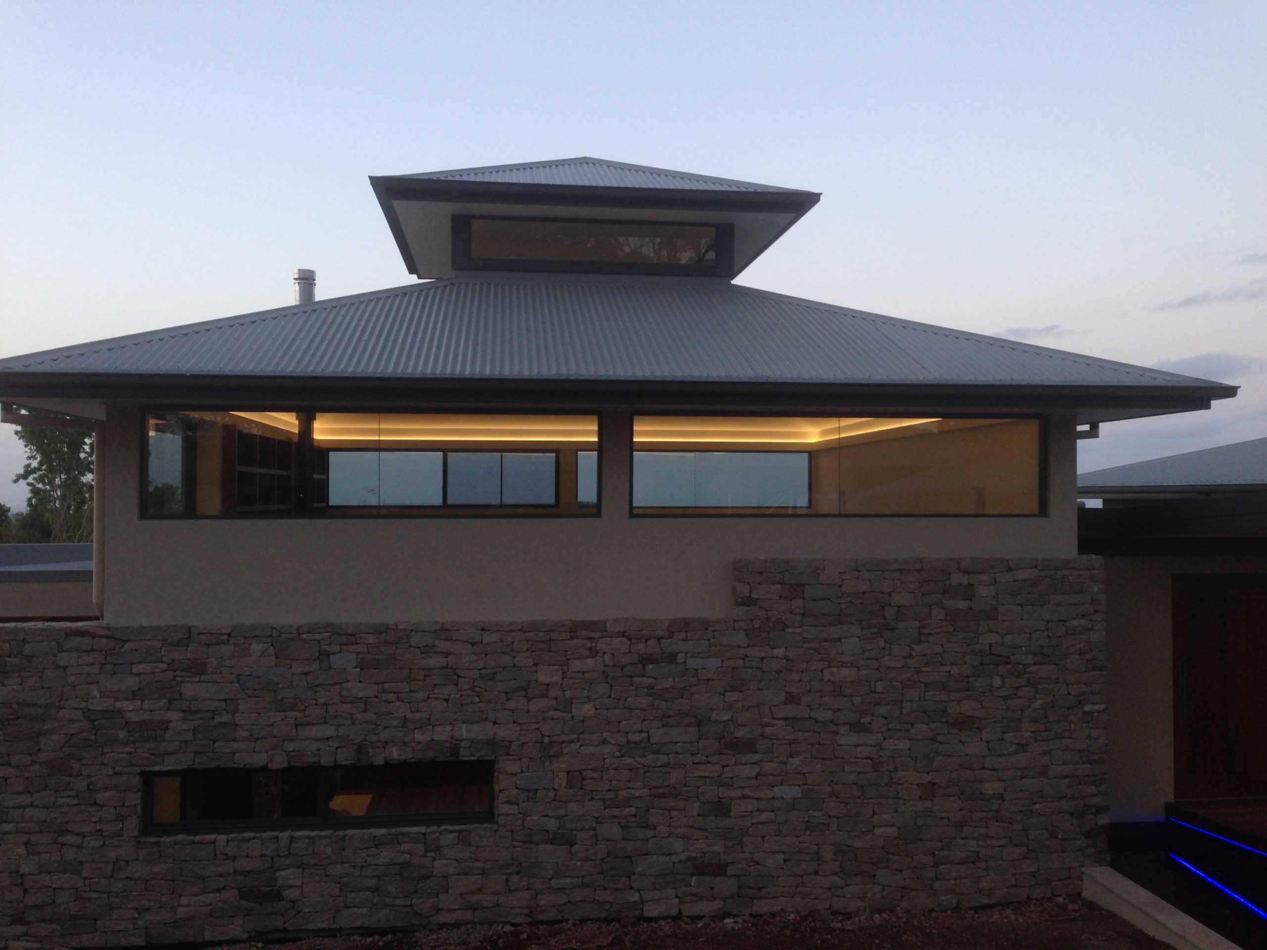 Main features include 6 bed rooms 5 with ensuits , 3 main living areas with mezzanine library , 13m long wet edge pool with reflection ponds, separate area for parents and guests that is connected by a timber bridge structure . A 190,000 ltr water tank built into the house ,separate art studio , Eco glass in the windows and doors , use of recycled materials, Timber and concrete . Extensive use of rock feature work to the exterior walls .